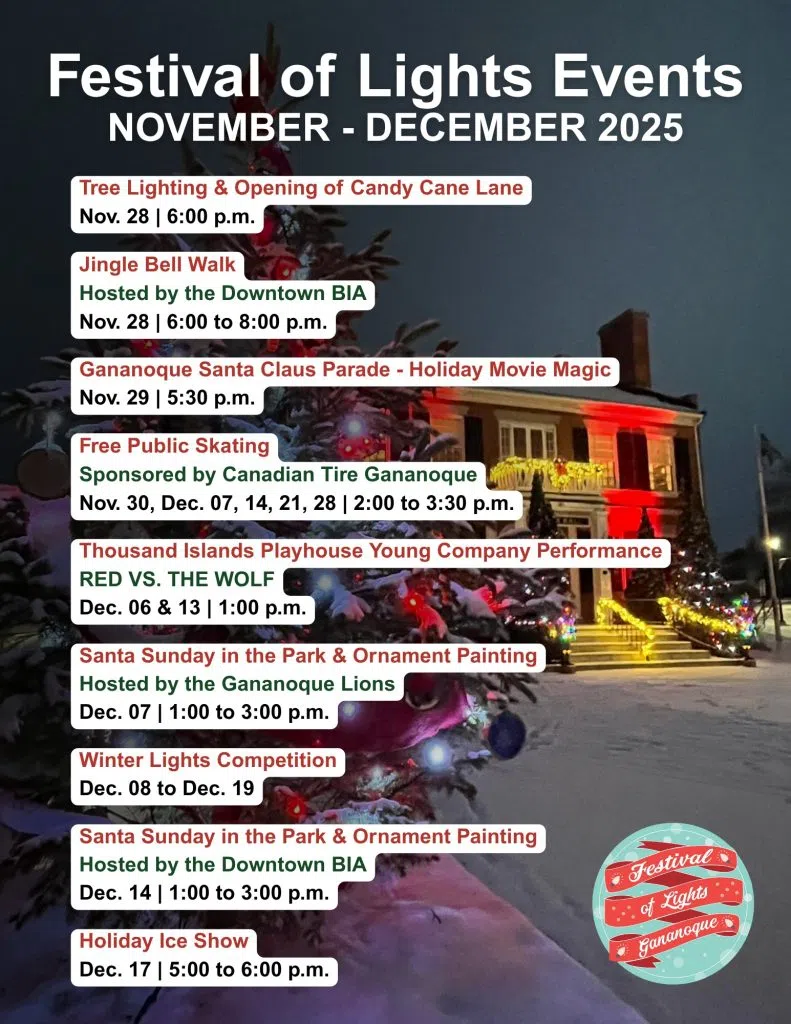 The 2025 Town of Gananoque Festival of Lights officially begins this Friday, November 28, with the Town Hall tree lighting and the opening of Candy Cane Lane at 6:00 PM in Town Hall Park (30 King Street East).