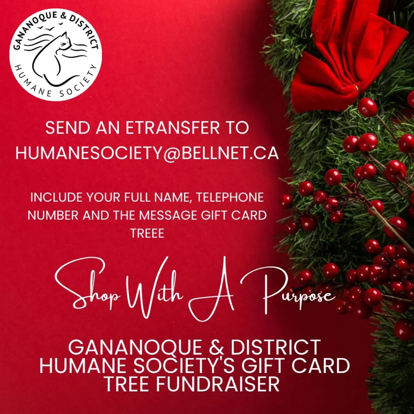 Send an etransfer to humanesociety@bellnet.ca with the message gift card tree, your name and phone number. We need this information to contact you if you are the winner.